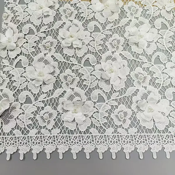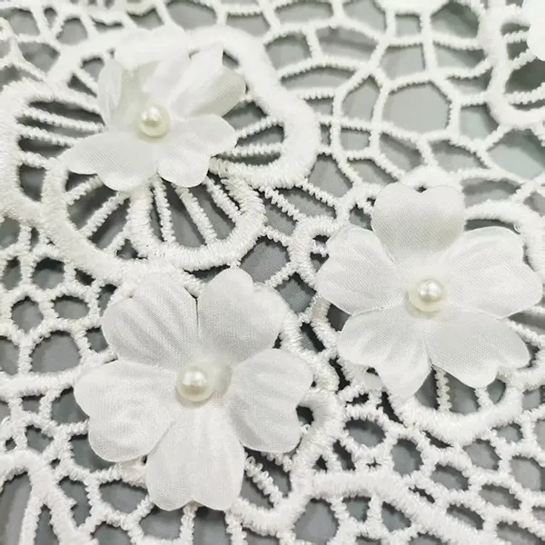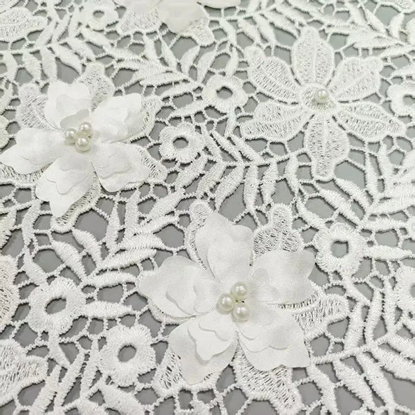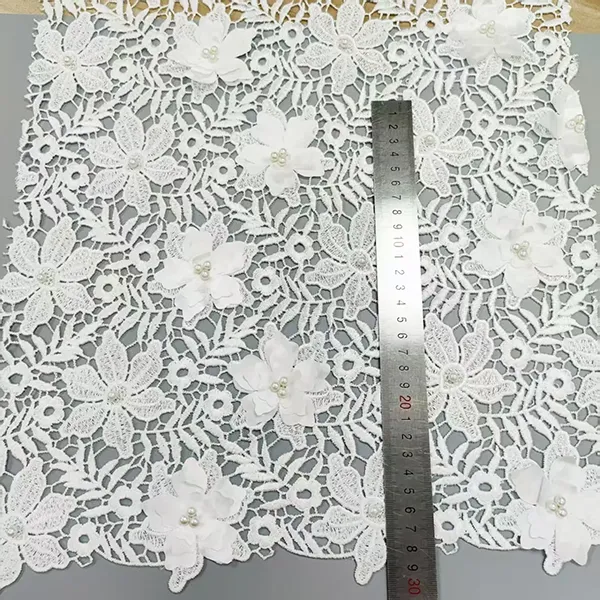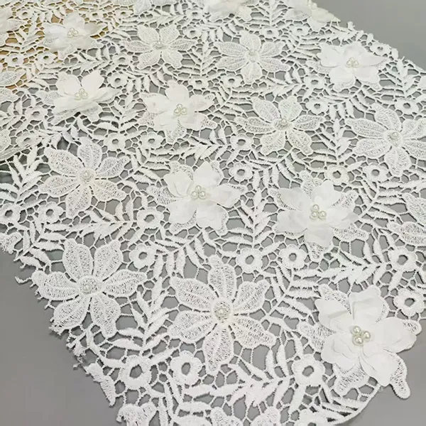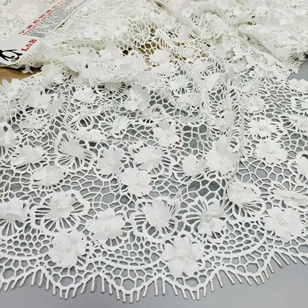 | Ime izdelka | 3d cvetna čipkasta tkanina biserna biserna voda topna vezena za vezenje Guipure čipka tkanina | ||