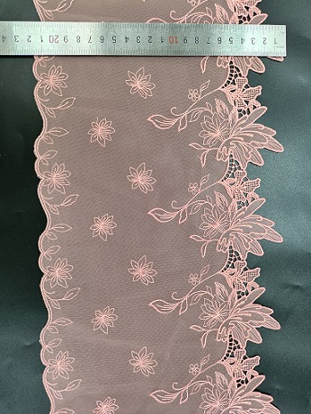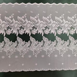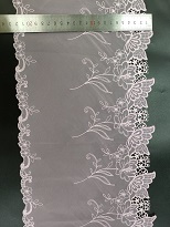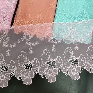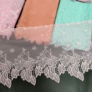 Vezena mrežasta čipkasta obloga je občutljiva in zapletena vrsta čipk, ki se pogosto uporablja kot dekorativni naglas na oblačilih, dodatkih in izdelkih za dekor doma. Ta vrsta čipk je ustvarjena s šivanjem ali vezenjem stroja na tanko plast mrežaste tkanine. Vezenje lahko prevzame različne oblike, vključno s cvetličnimi, geometrijskimi ali abstraktnimi dizajni. Tkanina mrežice zagotavlja občutljivo in zračno kakovost čipke, vezenje pa dodaja globino in teksturo. Vezena mrežasta čipkana obloga se običajno uporablja kot okras na oblačilih, kot so poročne obleke, večerne obleke in spodnje perilo. Prav tako je priljubljena izbira za dodajanje elegance elementov domačega dekorja, kot so zavese, prti in okrasne blazine. Vezena mrežasta čipkasta obloga je v različnih barvah in širinah, kar omogoča široko paleto možnosti oblikovanja. Ne glede na to, ali želite svojemu projektu dodati vintage ali sodoben dotik, je vezena mrežasta čipkasta obloga brezčasna in lepa izbira.
