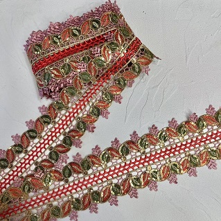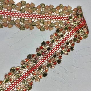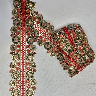 Zlate sekvence barvite vezene guipure čipke je vrsta čipk, ki se pogosto uporablja za dekoracijo oblačil. Ta čipkasta obloga je običajno narejena iz baze čipke, ki je težka in trpežna čipka, ki je znana po svoji dvignjeni teksturi in gostoti. Barvita vezenja in pajkice se dodajo na čipkasto oblogo v zapletenih vzorcih, kar ustvarja čudovit dizajn.
