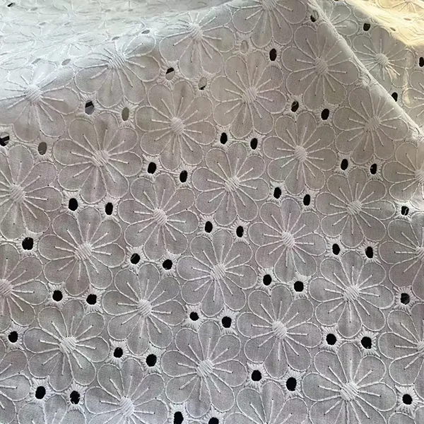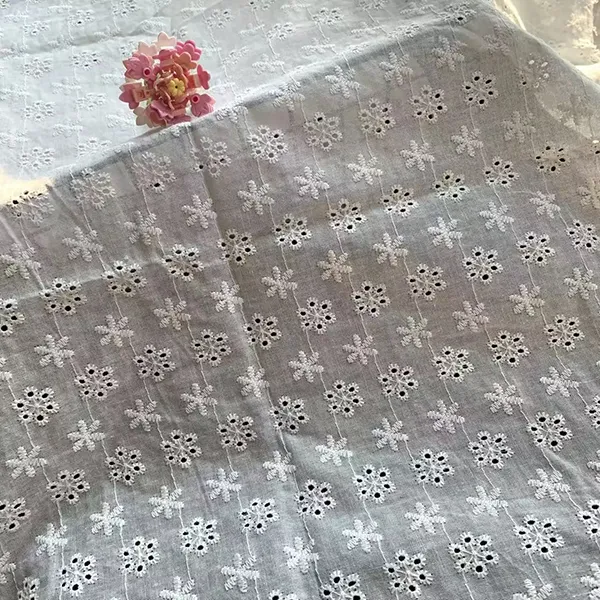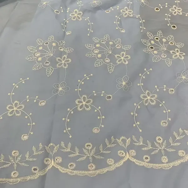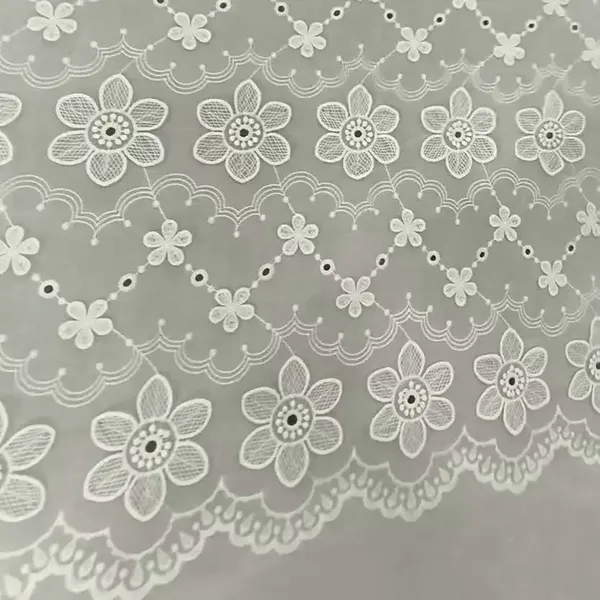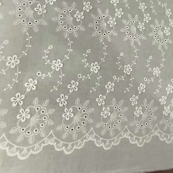 Bela bombažna čipkasta vezena tkanina za obleko Ta elegantna čipkasta tkanina ima občutljivo vezenje in rezanje očes, kar ustvarja dihajoč, lahek material, kot nalašč za obleke, bluze in poročno obrabo. Zapleteni cvetni vzorci in loputani robovi dodajajo romantičen, vintage čar, medtem ko naravni bombaž zagotavlja mehkobo in udobje.