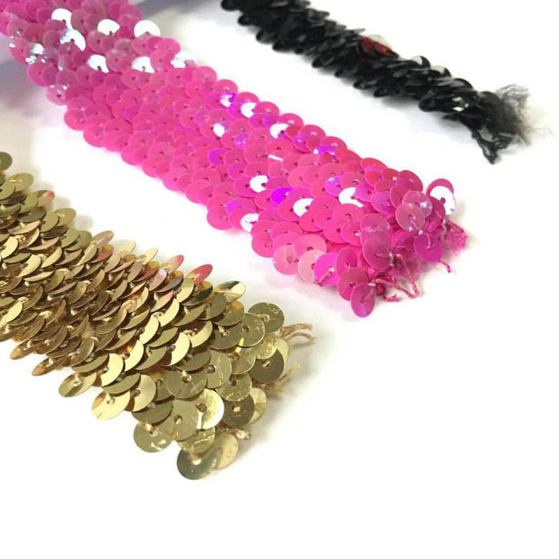 Različna širina bling zaključna pletenica Elastic Sequin čipka, ki je na voljo v več širinah, ima elastično podlago, povezano s sijočimi pajkicami, ki ji daje sijajen sijaj. Primerno je za odrske kostume, večerne obleke ter okraske za čevlje in klobuke